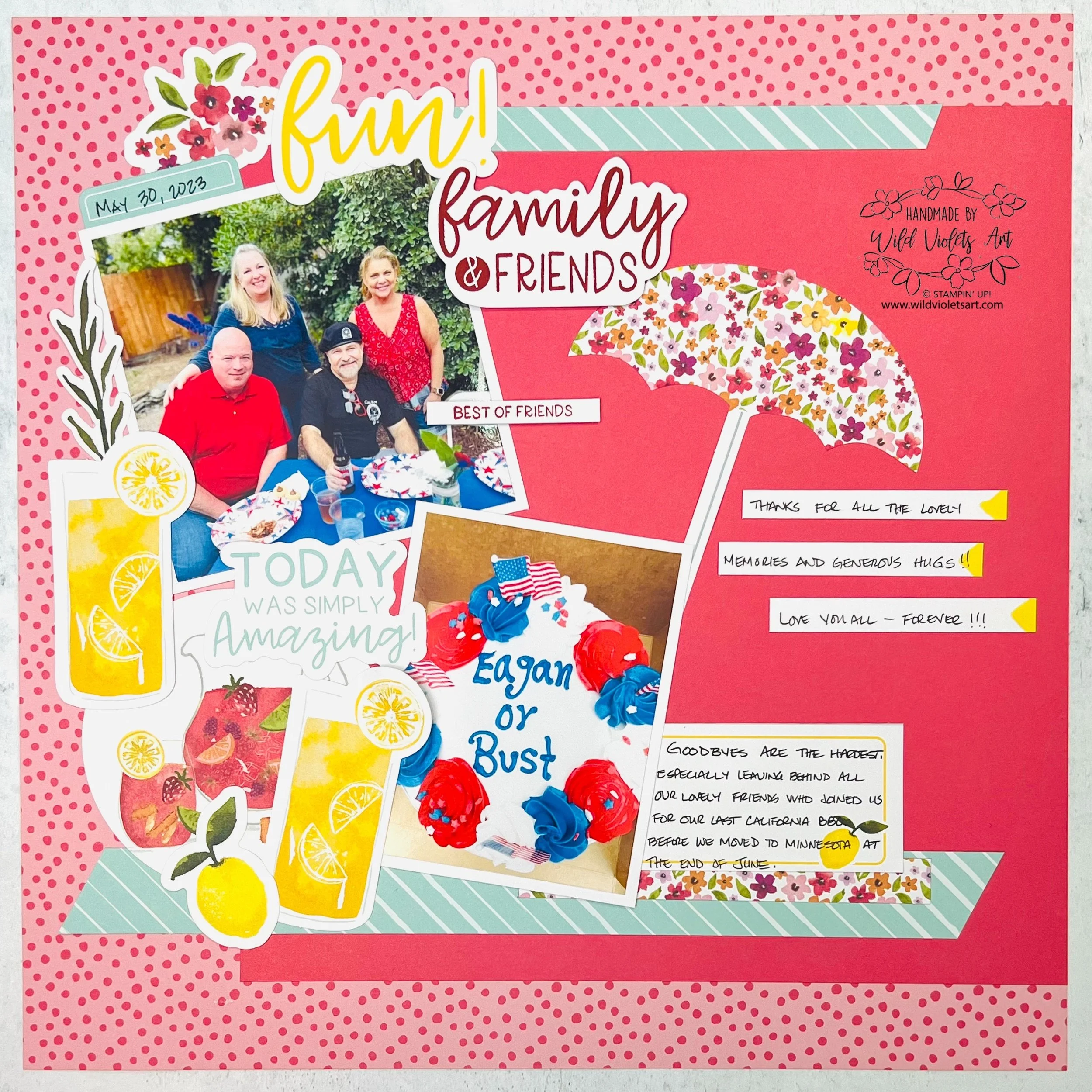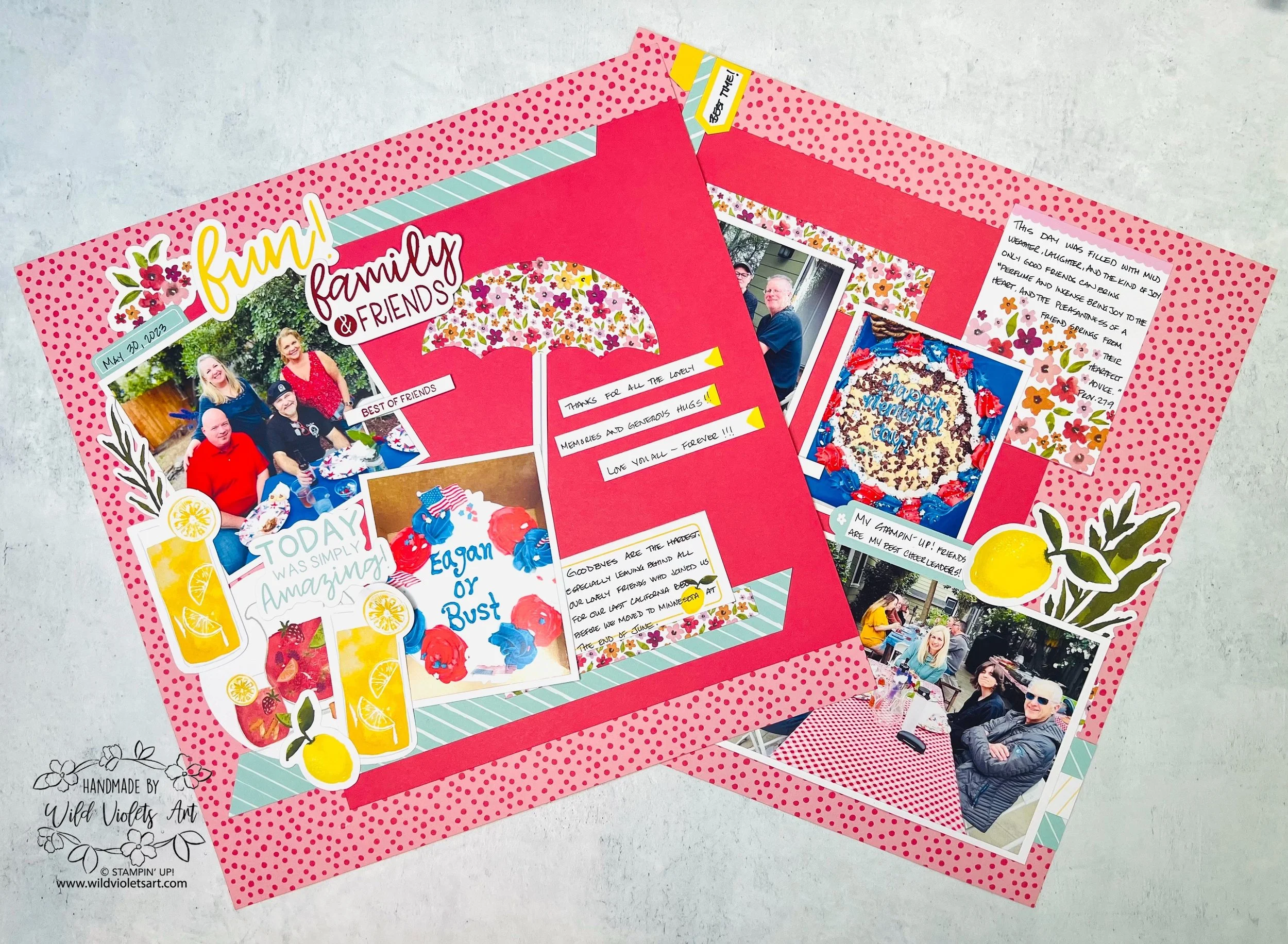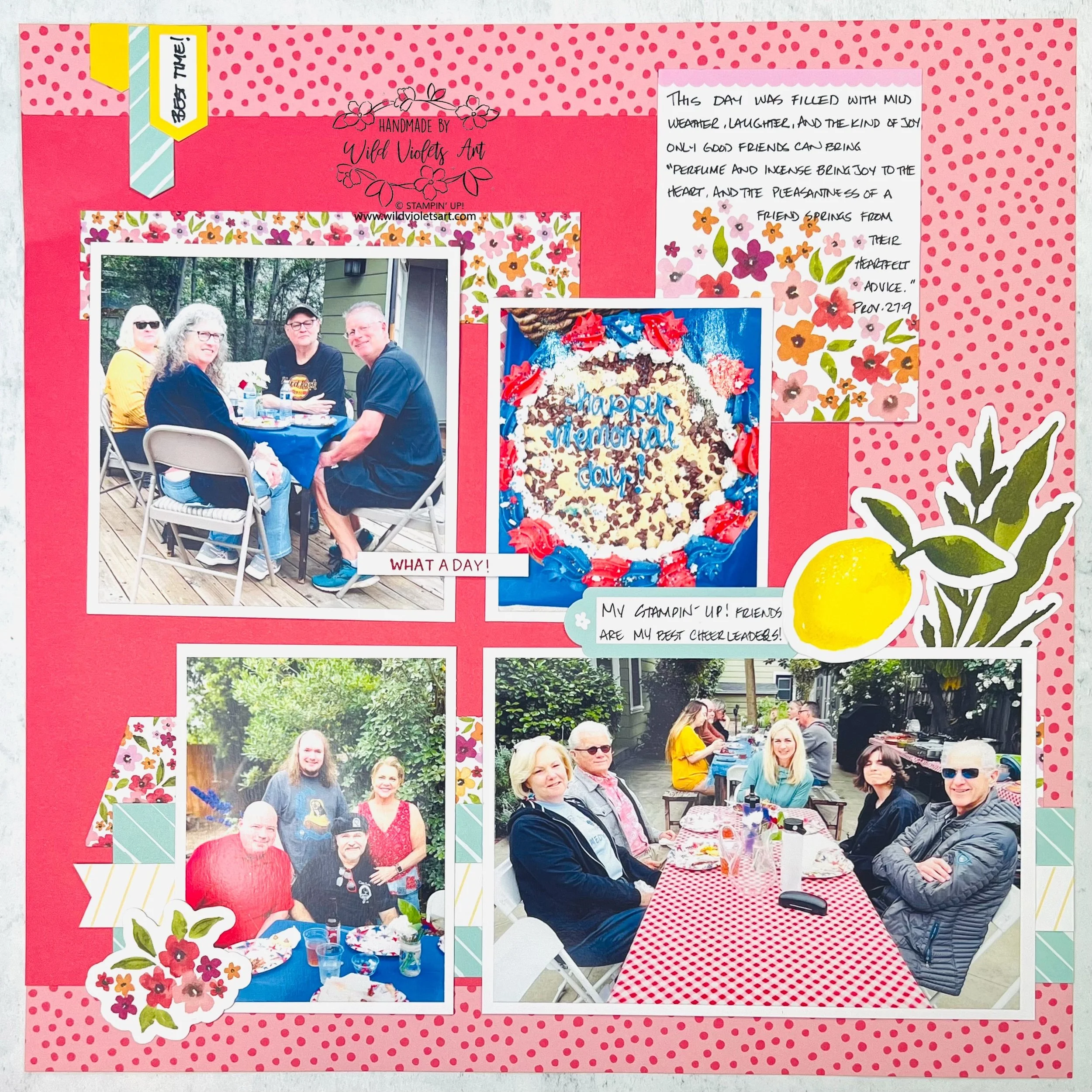 The bold Strawberry Slush and pink background cardstock, paired with Pool Party stripes and fresh fruit accents, set the tone for a happy, playful design. I layered photos from our May 2023 gathering and used pre-cut die-cuts and stickers from the kit to add a splash of whimsy and movement across the pages.