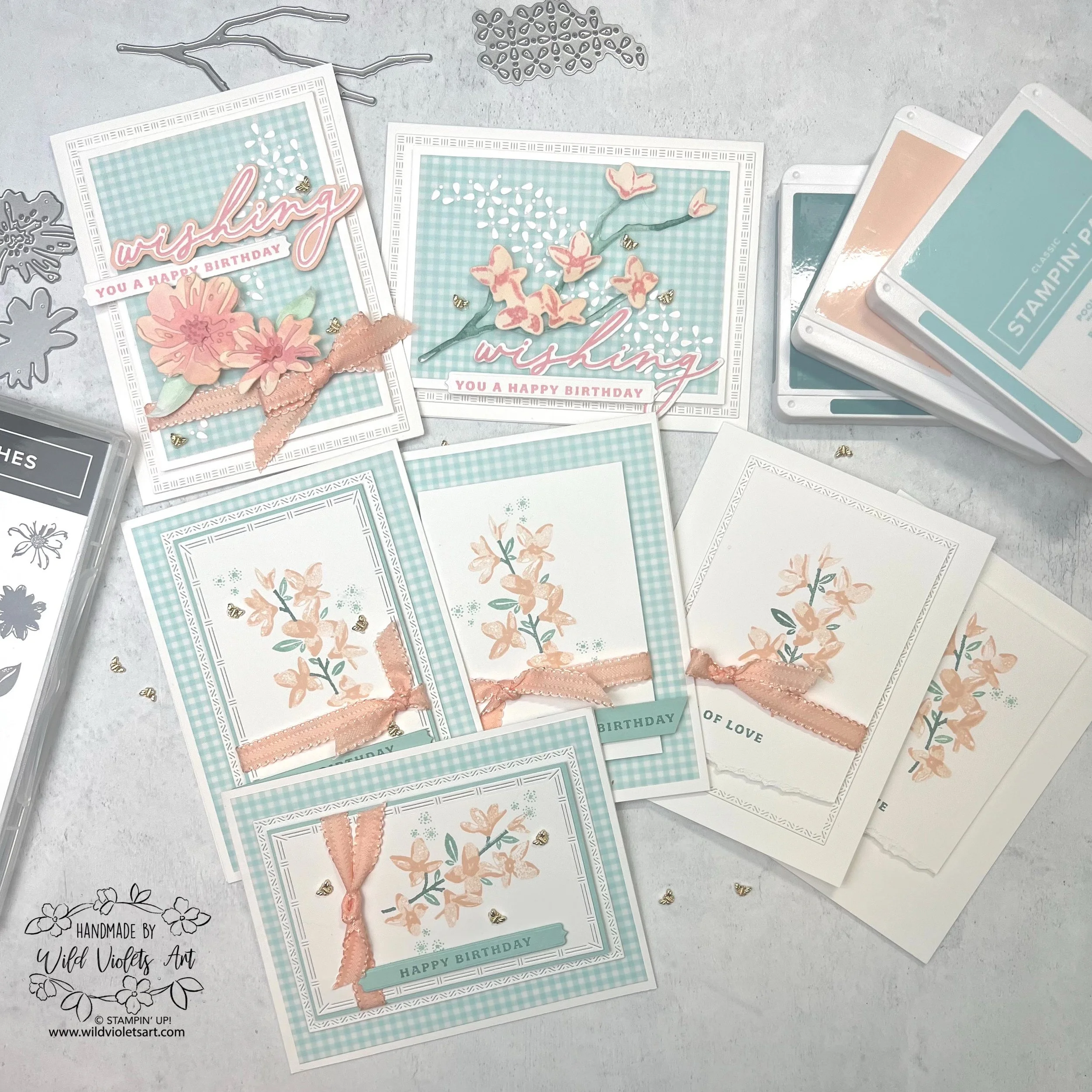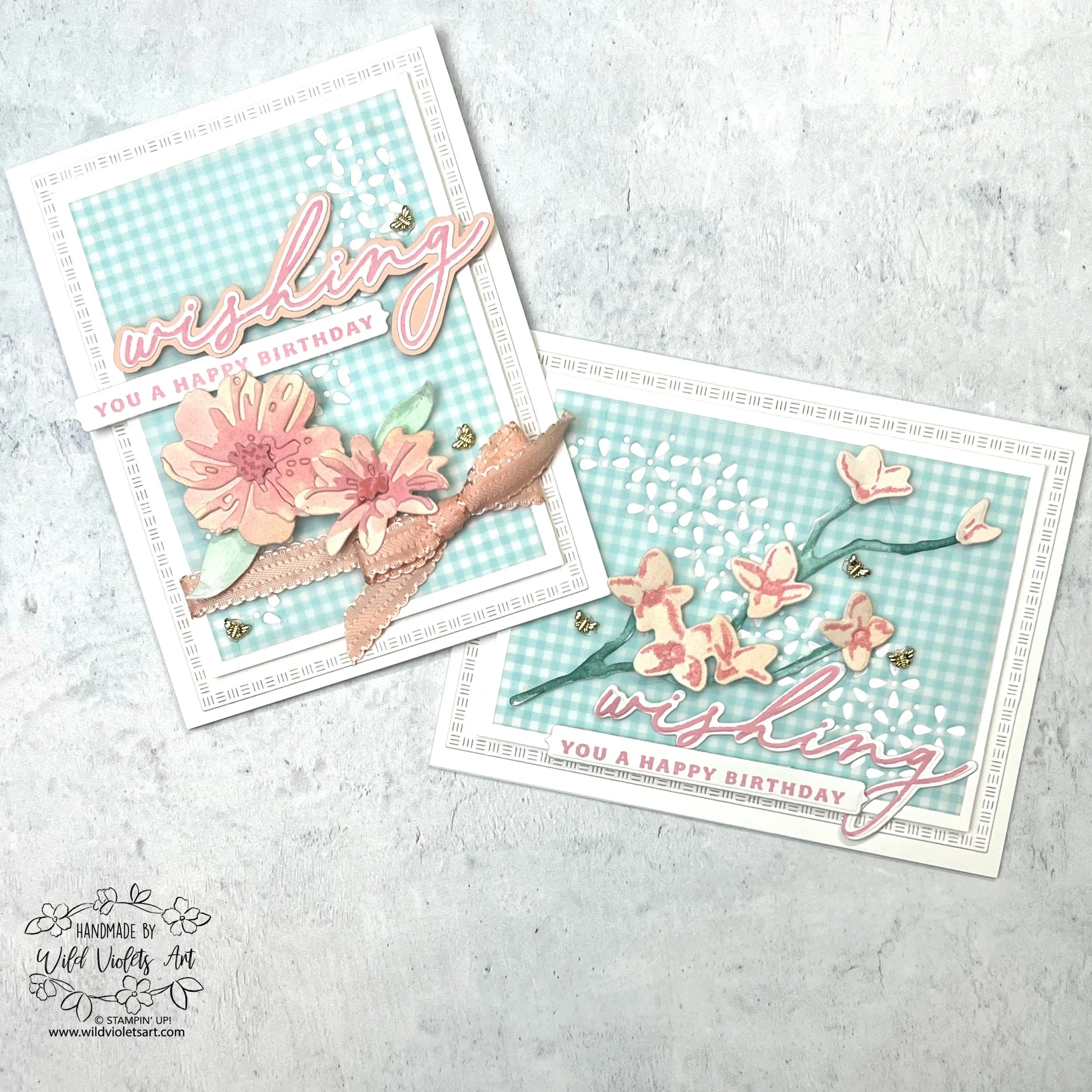 These two cards had even more added to them with the watercolored florals like my Floral Delight post. I also used the “wishing” stamp and die to create sweet sentiment for the card. I again used Petal Pink and Pretty In Pink inks for the florals and sentiment.