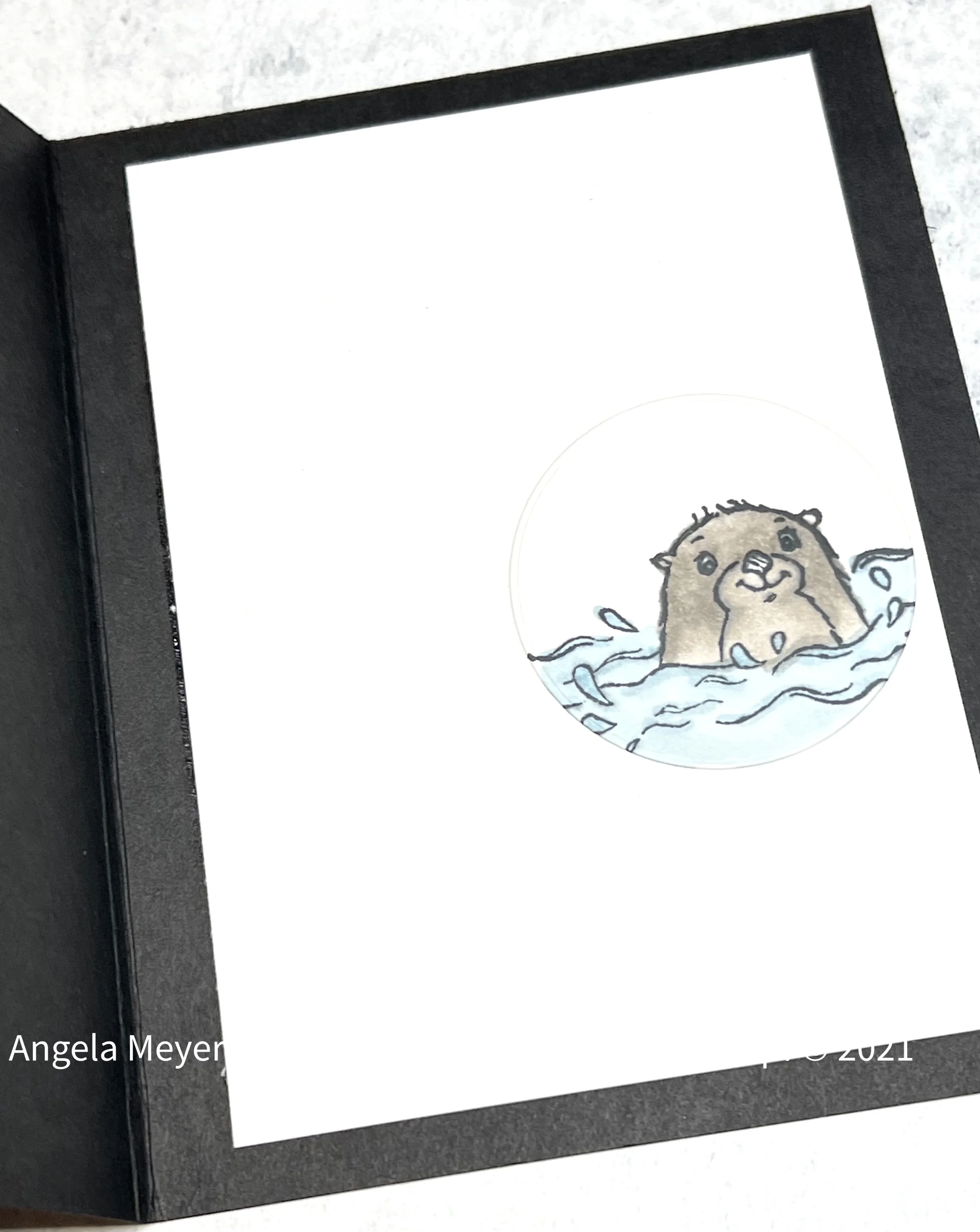 I enjoy making shaker cards, as they are always a big hit with my grandkids. This sweet little otter peeks out of a shaker window, with the sequins adding to the splashing water. I paired the otter with the FREE Sale-a-bration Simply Marbleous DSP, showing the silky satin side. The DSP (per image below) has two sides, one satin and the other marble. I used a Basic Black CS base (5-1/2”x8-1/2”, scored at 4-1/4”), with a piece of DSP (4”x5-1/4”) glued down over it.