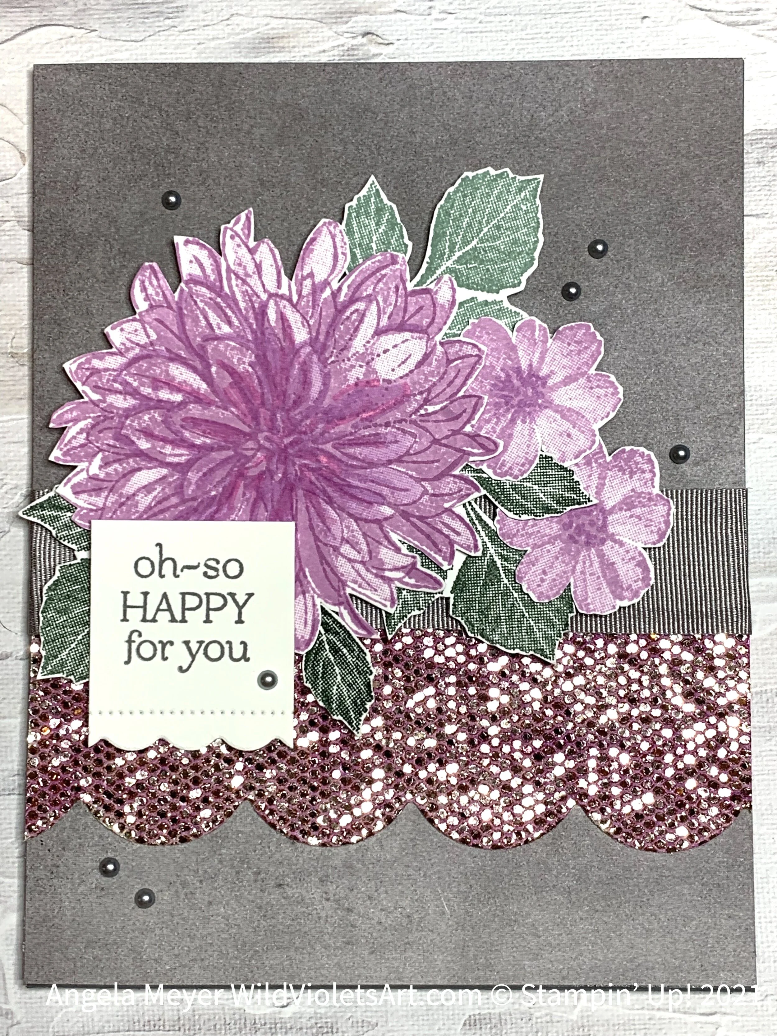 The verses with this FREE Sale-a-bration Delicate Dahlia Stamp Set are so sweet, and this verse was stamped in Basic Gray ink on a Basic White CS scrap cut with the Scalloped Contours dies. I fussy cut the dahlia blossoms, stamped in Fresh Freesia ink, with both the two-step stamps for the large dahlia and only the photo realistic stamp for the smaller blossom. The leaves were stamped with both Soft Succulent ink and Evening Evergreen ink, then fussy cut as well. I layered the foliage over the Smokey Slate Textured Ribbon, over the lovely new FREE Be Dazzling 6”x6” Specialty Paper, colored with the dark Fresh Freesia Blends pen and die cut with the Scalloped Contour dies. The base card is Basic White Thick CS, covered with a piece from the In Good Taste DSP. The final touch was the Metallic Pearls in silver. I just love this card! more pics below…