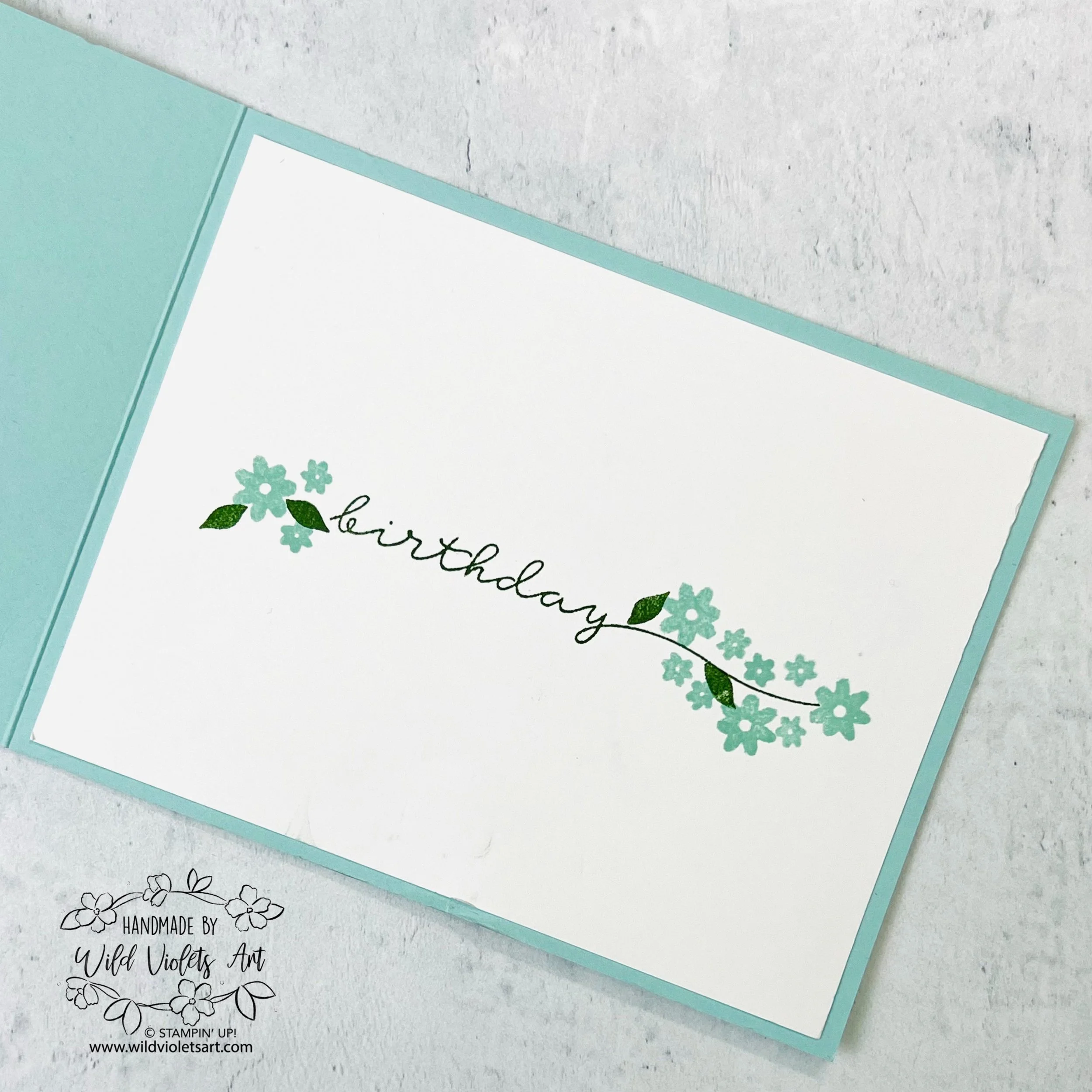 For the inside of my card, I added a 4”x5-1/2” layer of Basic White cardstock, then stamped “birthday” and leaves in Garden Green ink. I then used Pool Party ink to add the flowers. I used the same flowers and leaves on my envelope for coordination! Such a sweet and simple card!