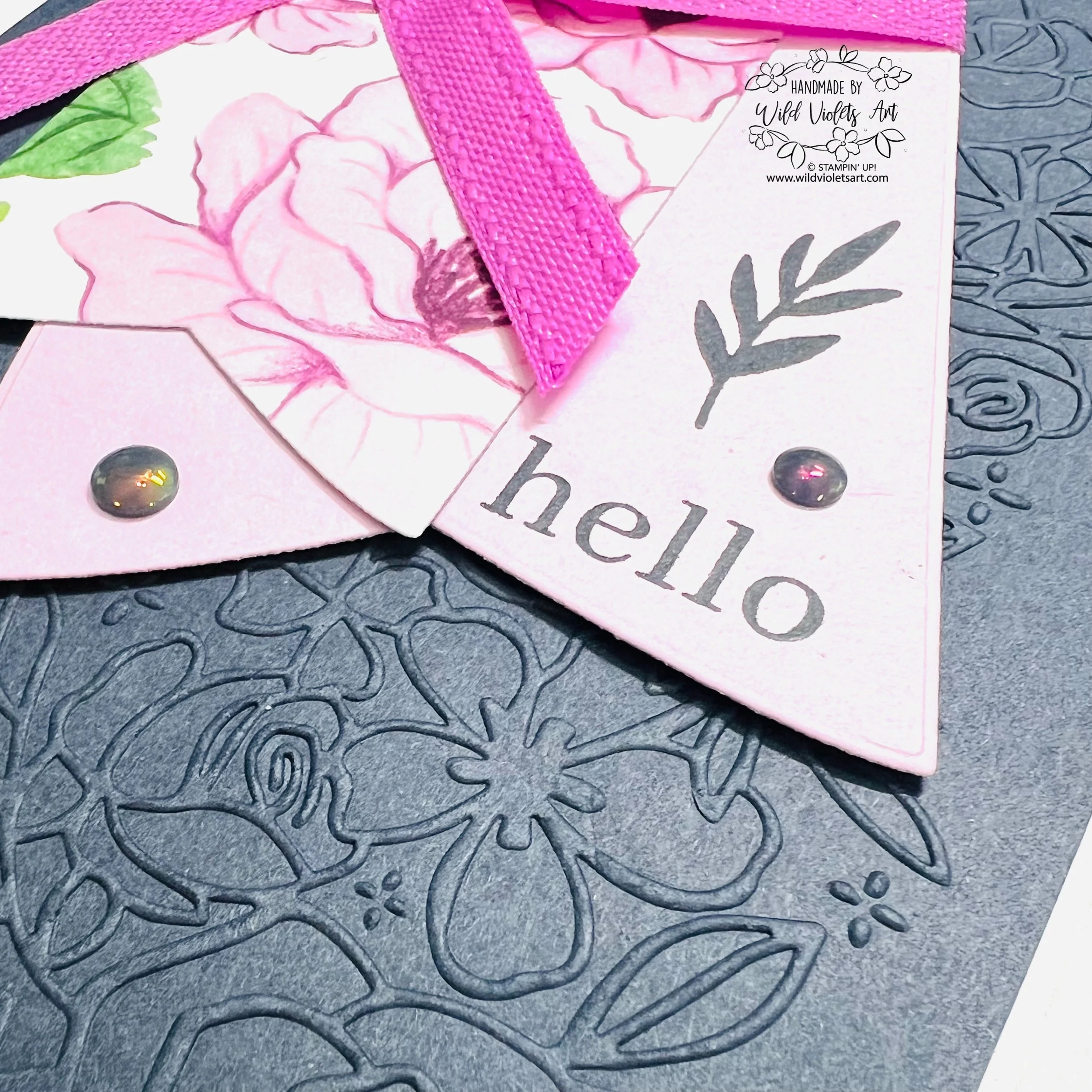 This sweet card is so fun using the Blooming Phrases Stamp Set. For this card, I used a 4-1/4”x11” piece of Pool Party Cardstock to create an A2 card base. I then added a 3”x4” piece of Floral Impressions DSP on the right side of the card base. On a 2-3/4”x3-3/4” layer of Basic White cardstock, I used Garden Green ink to stamp the “happy” three times and the leaves along the stem. Then using my Petunia Pop ink, I stamped the flower in the middle. Watch my video so you can see how I got my two other flowers two-toned.